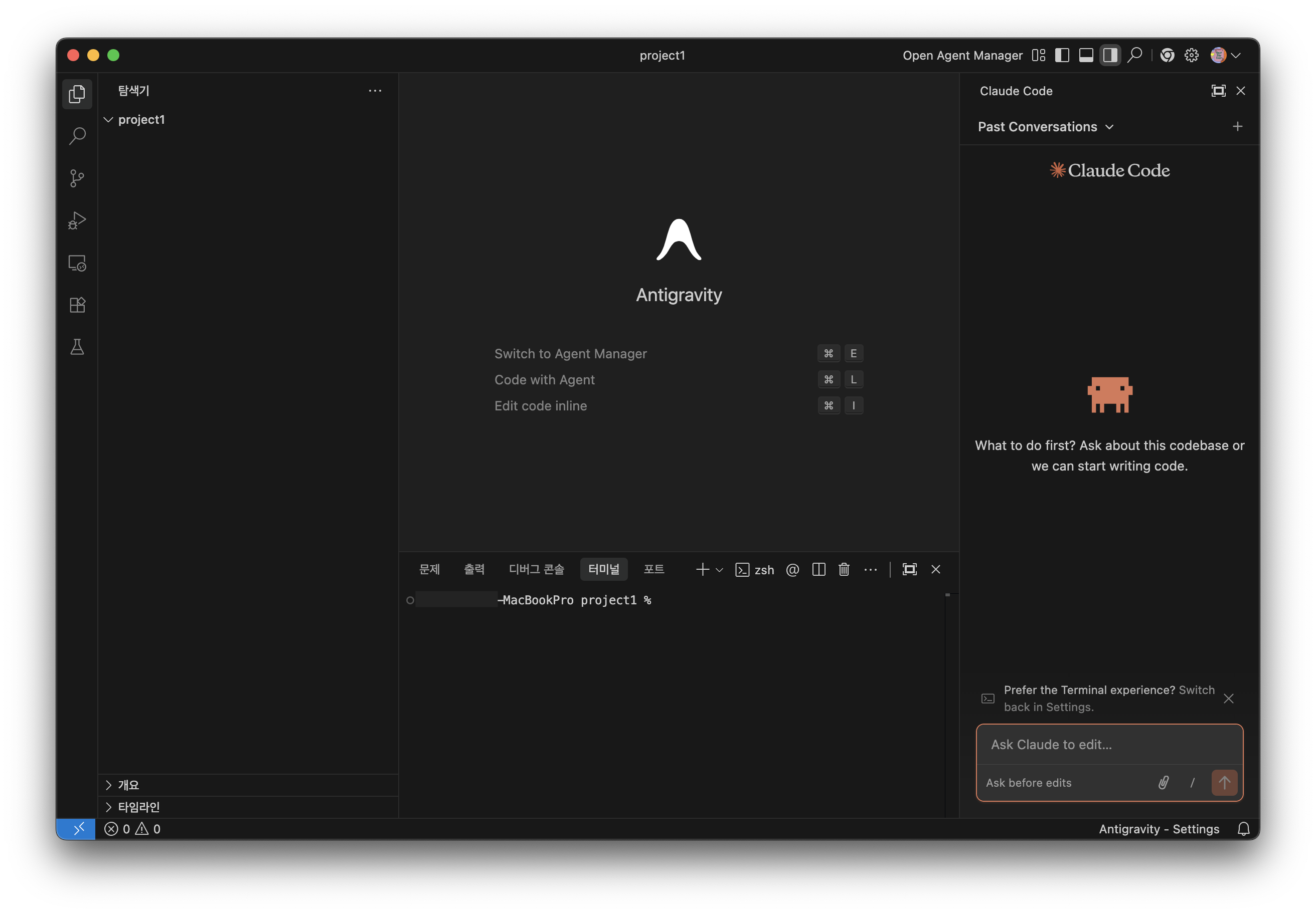 Antigravity 하단의 터미널 패널에서 바로 사용할 수 있다. 별도로 macOS 터미널 앱을 열 필요가 없다.