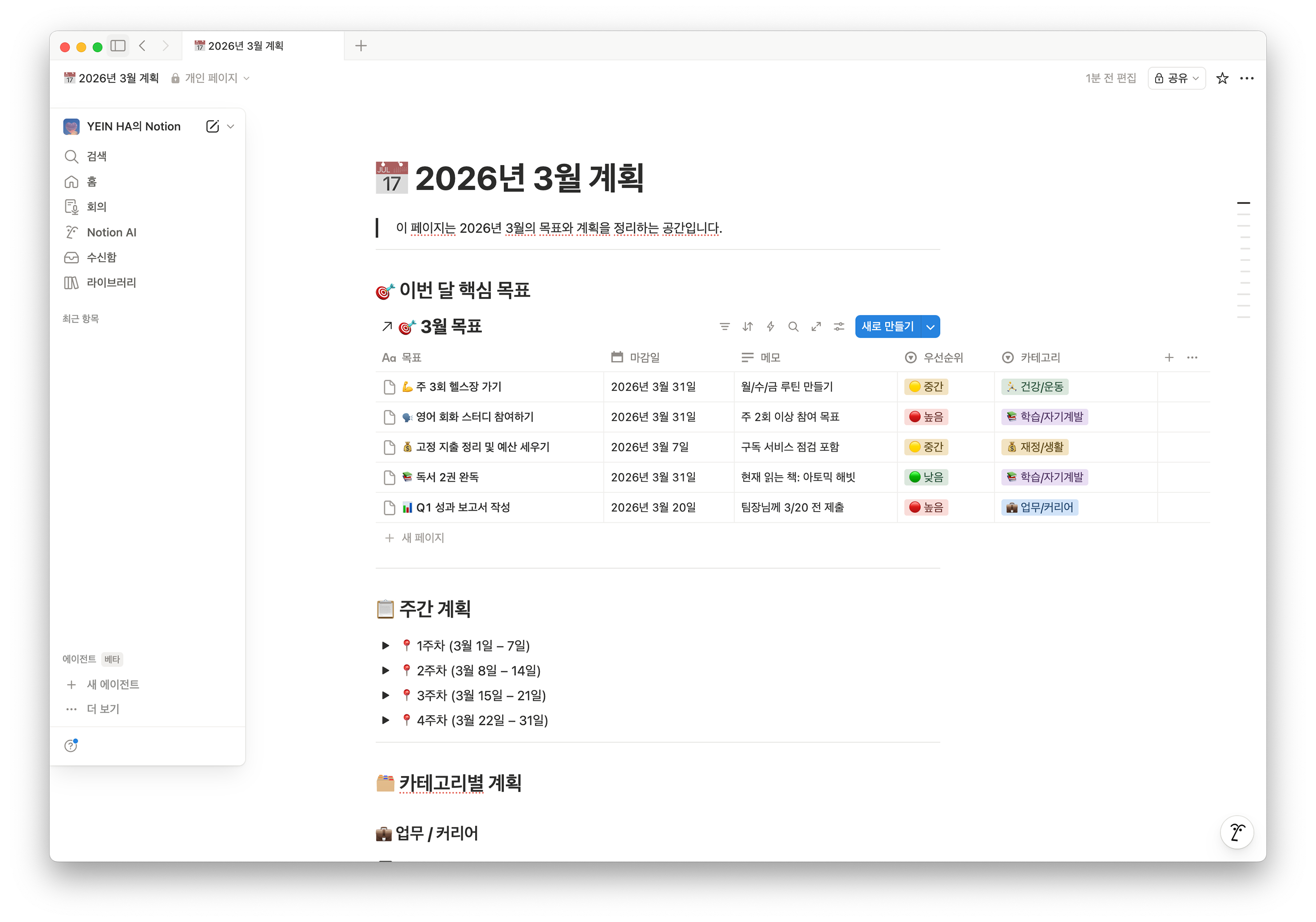 "내 Notion에 '2026년 3월 계획'이라는 페이지 만들고, 내 계획을 입력할 수 있는 레이아웃을 구상해줘."