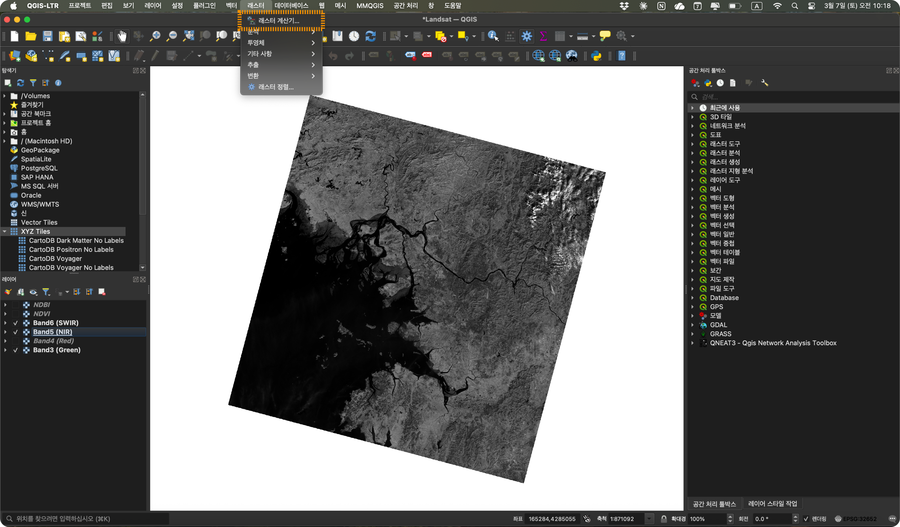 레이어 패널에 Band3 (Green), Band5 (NIR), Band6 (SWIR)이 모두 표시되면 준비 완료다.