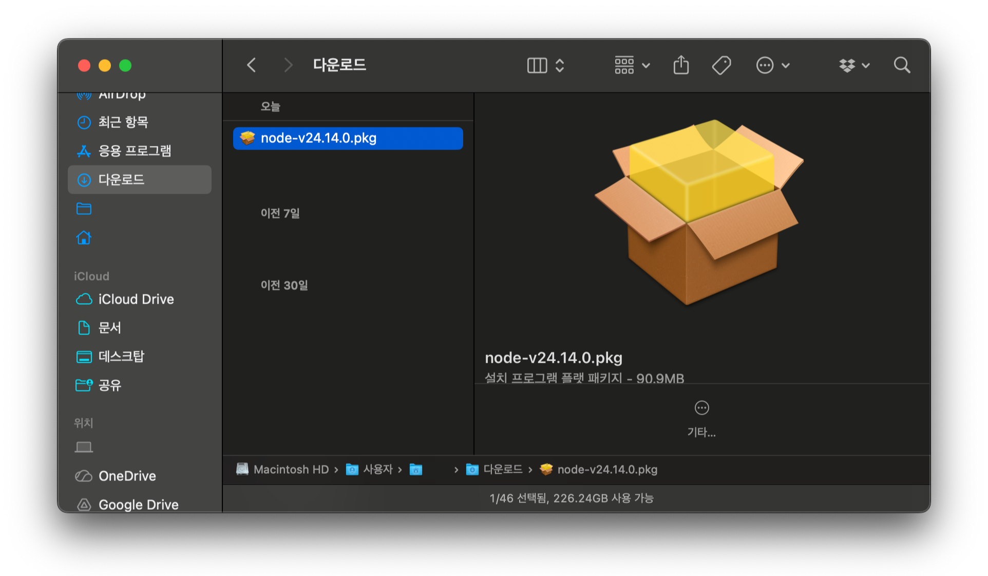 다운로드 폴더에 node-v24.x.x.pkg 파일이 받아졌을 거다. 더블클릭해서 실행.