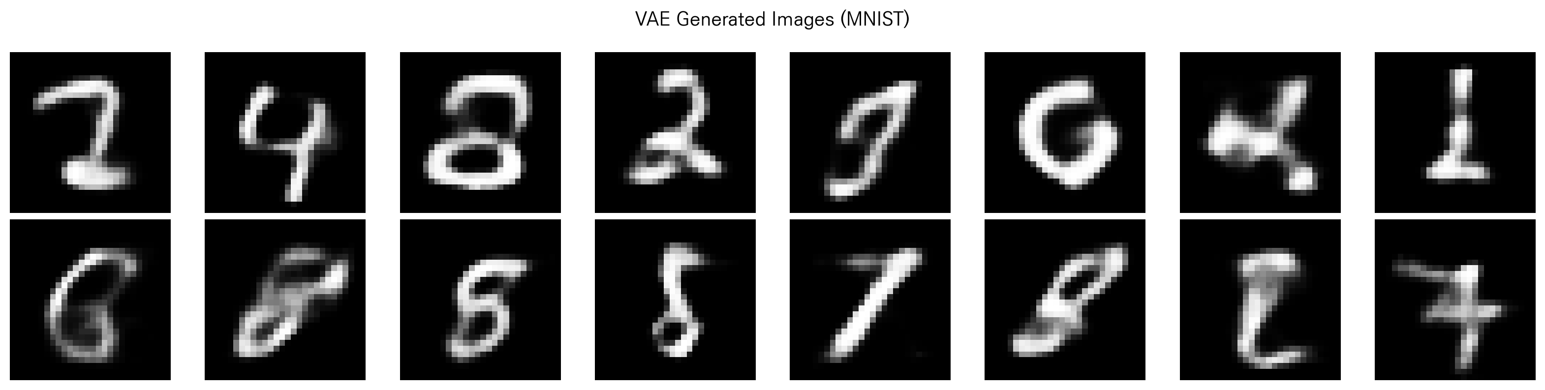 plt.suptitle("VAE Generated Images (MNIST)", fontsize=14)